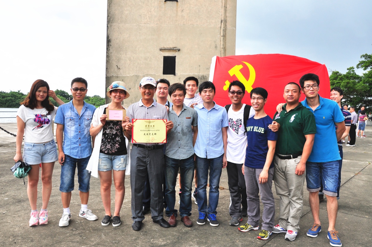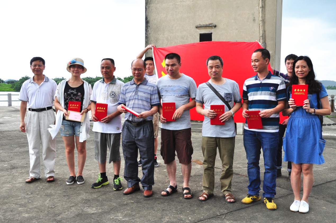 參觀當(dāng)天,艷陽高照,在歡聲笑語的旅游車上,建黨紀念活動首先在熱烈的黨史知識有獎問答競賽拉開了帷幕。當(dāng)答題告罄,獎品紛紛易主時,汽車就抵達開平南樓。該樓建于1921年,樓高七層19米,每層均有機槍和探照燈,是司徒氏人為防盜賊而建??箲?zhàn)時期,七名歸僑及僑屬青年曾在此堅守八天九夜痛擊日軍,最后彈盡糧絕,壯士全部捐軀。七壯士雕塑雄壯威武,英靈如塔,藍天之下,民族精神直沖云霄。我們就在當(dāng)年這一浴血奮戰(zhàn)的所在默默地緬懷,莊重地對獲得2015年度先進黨支部和優(yōu)秀黨員進行表彰,展開鮮艷的黨旗合影……過程中,我們幾乎聽到烈士群像的呼吸。